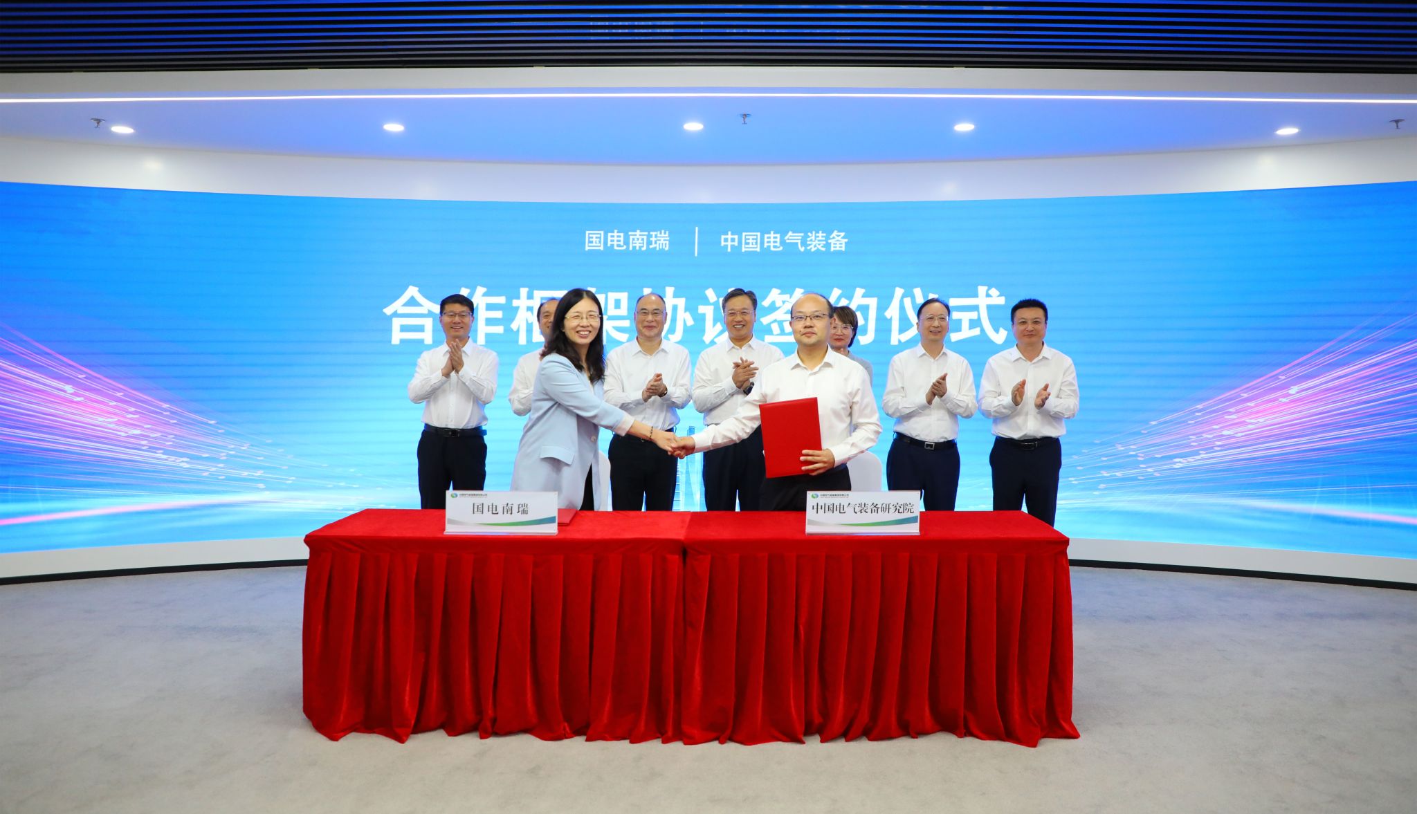 集团公司科学技术研究院副总经理牛化鹏和南瑞集团党委委员、国电南瑞副总经理蒋元晨分别代表科学技术研究院和国电南瑞签订合作框架协议,闫华锋、郑宗强、庞腊成、倪斌、谢庆峰、张帆、钟建英见证签约。