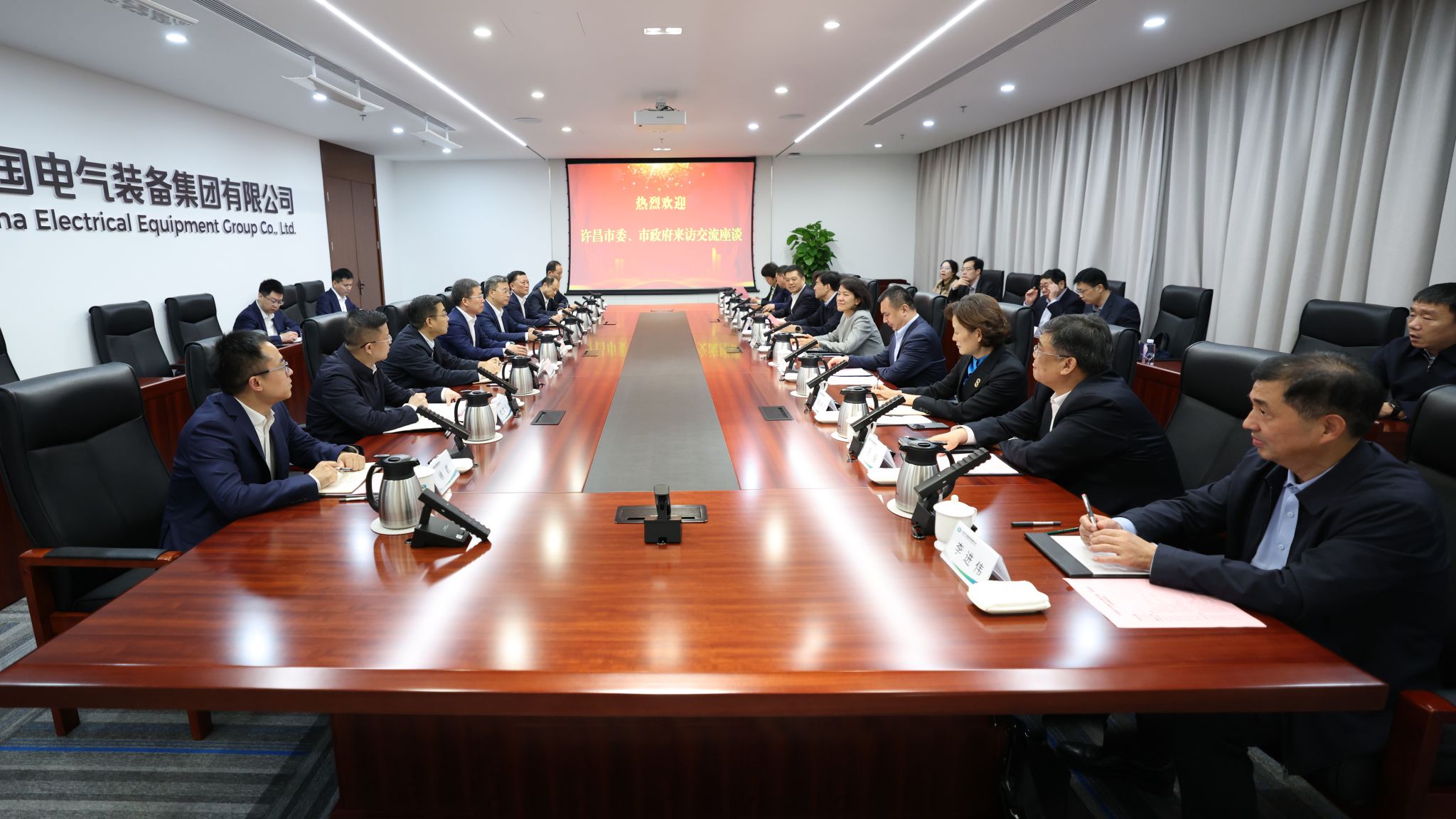 11月7日,中国电气装备党委书记、董事长李洪凤,党委副书记、总经理闫华锋在集团公司总部与来访的许昌市委书记杨小菁一行举行会谈,双方就进一步深化合作进行座谈交流。许昌市委常委、秘书长唐飞,市委常委、市政府常务副市长刘军伟,市政府副市长赵淑红;集团公司党委常委、副总经理张旭升参加会谈。