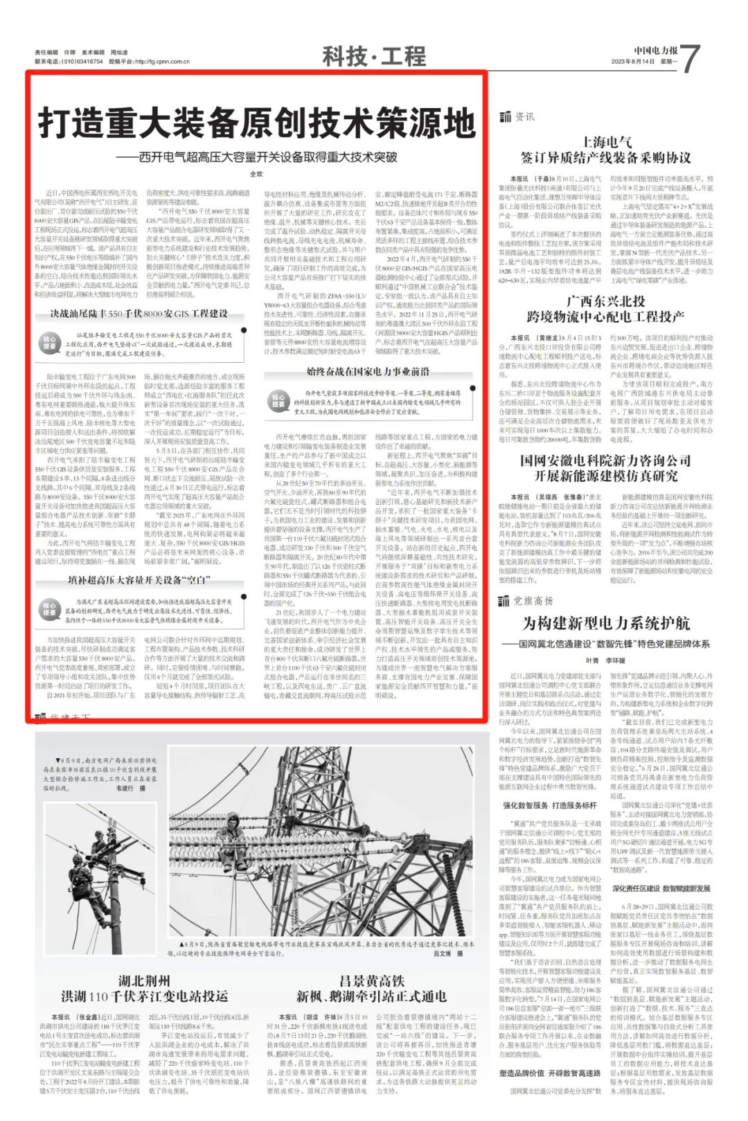 中国西电集团、中国西电将牢记“国之大者”,持续完善创新体系,激发创新活力,促进产业链深度融合,打造原创技术策源地,加快关键技术、核心产品迭代升级,推动新型电力系统建设,为建设世界一流智慧电气装备集团贡献西电力量!