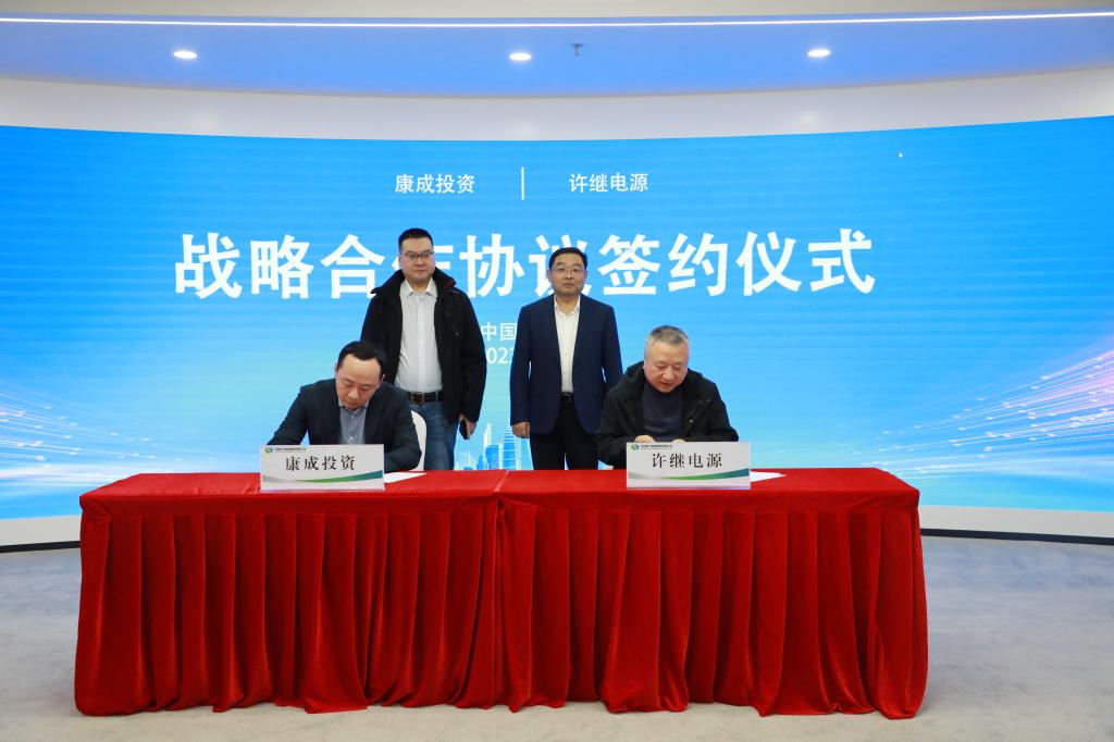 中国电气装备市场运营部(安全质量部)部长赵建宾,高鑫零售招商部总经理李振出席签约仪式,许继电气电源公司党委书记、董事长郑志,高鑫零售招商部协理马嘉春代表双方签订合作协议。