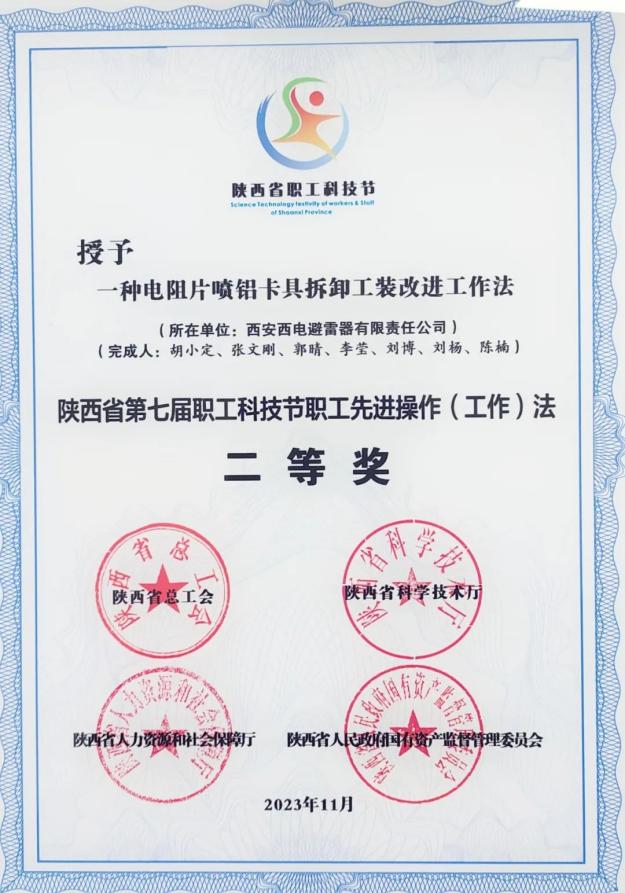 陕西省职工先进操作(工作)法二等奖——中国西电所属西电避雷器“一种电阻片喷铝卡具拆迁工装改进工作法”