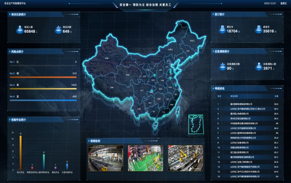 安全生产风险管控平台。平台主要实现安全管理业务目标、投入统计、隐患排查、应急、培训考试以及环保、职业健康管理业务的数字化管理,实现远程生产现场视频接入。支持对危险源进行网格化管理,通过二维码链接互动确保不同层级危险源巡检无死角。目前已实现集团本部及所属单位全覆盖应用,实现安全业务规范管理,确保安全管理可视、可查、可追,助力集团安全稳定生产局面。