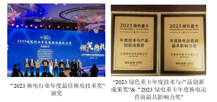 2023年12月23日,许继携智能重卡换电站入围由中国充电桩网与充换电百人会联合主办的“2023中国换电行业年度品牌”评选,荣获“2023换电行业年度最佳换电技术奖”;入围中国电车资源主办的“中国新能源物流车2023绿色城配&绿色重卡年度品牌”评选,荣获“2023绿色重卡年度技术与产品创新成果奖”和“2023绿电重卡年度换电运营商最具影响力奖”。