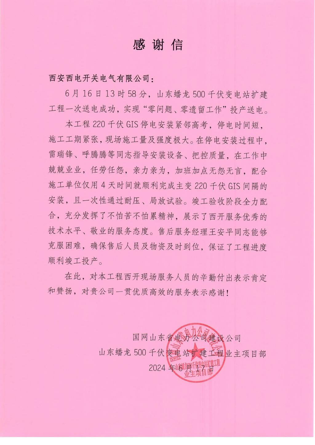 近日,中国西电所属西开电气凭借其卓越的专业能力和细致周到的服务,获得了多家用户单位的高度认可和赞誉。用户们纷纷发来表扬信,对西开电气在安装、调试及售后服务等多个环节中展现出的责任担当和匠心精神给予了高度评价。