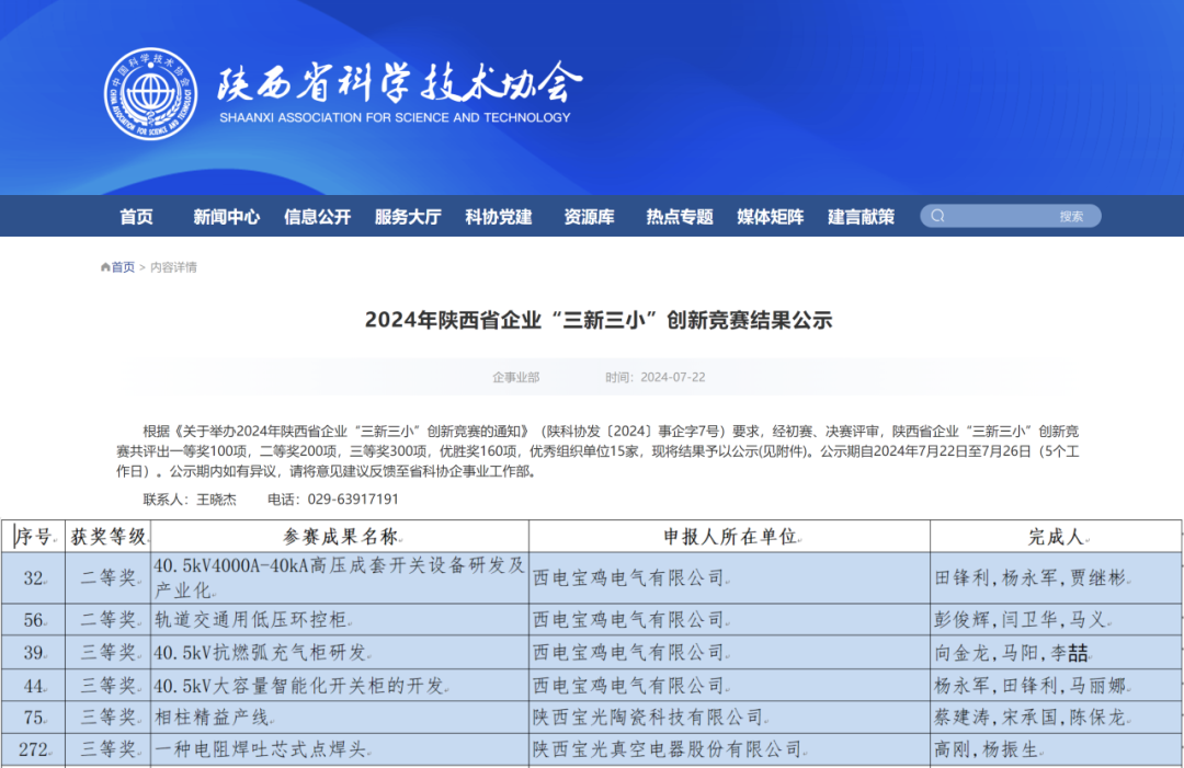近日,在2024年陕西省企业“三新三小”创新竞赛大会上,中国西电集团所属宝光集团所属西电宝鸡电气参赛的“40.5kV4000A-40kA高压成套开关设备研发及产业化、轨道交通用低压环控柜”荣获二等奖;“40.5kV抗燃弧充气柜研发及40.5kV大容量智能化开关柜的开发”荣获三等奖;所属宝光股份参赛的“一种电阻焊吐芯式点焊头、相柱精益产线”荣获三等奖。此次获奖是对宝光集团科技研发水平及成果转化应用的又一次高度肯定和认可,同时也是对宝光集团在创新发展道路上的激励和鞭策。