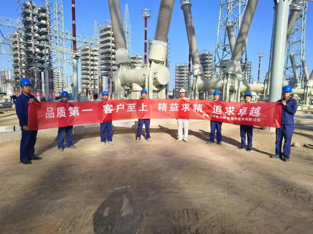 为确保项目的顺利实施,西开电气首次在800kV罐式断路器安装现场引入了智慧安装管控平台,精心选派了一批由经验丰富的技术骨干组成的安装团队赶赴现场,并制定了详尽的《重大工程策划书》及《现场安装进度计划》。同时,西开电气党委高度重视,党委委员、副总经理孙飞舟多次赴现场与业主、监理及安装单位沟通协调,主动加强了现场安装质量全过程管控力度,规范了现场安装团队严格按照设计图纸、工艺质量标准进行施工的要求,确保了安装进度与质量在“一次干好、一次干对”的前提下同步推进。在交流系统及相关 750千伏接入系统调试阶段,西开智慧服务党总支积极组织相关专家、研发人员及现场调试人员紧密协作,共同分析调试数据,经过不懈努力,设备顺利通过了5轮次C2级背对背电容器组开合试验,为工程的稳定运行提供了有力保障。
