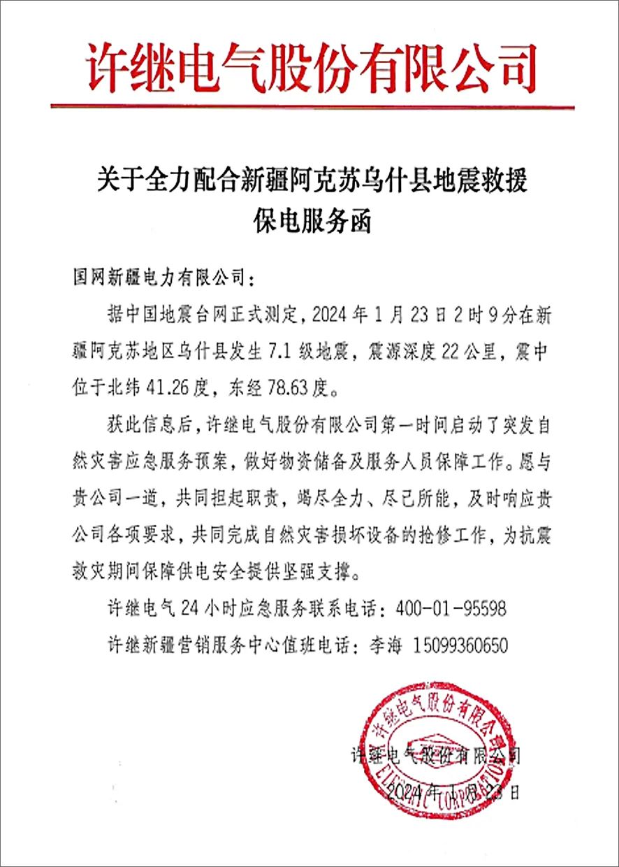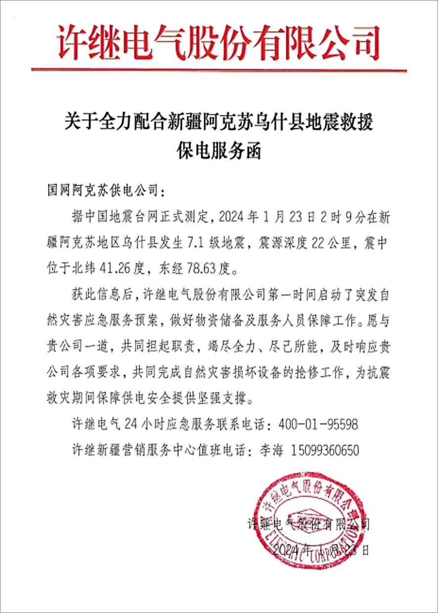 2024年1月23日2时9分新疆阿克苏地区乌什县发生7.1级地震,许继电气迅速响应全面开展抢险救灾相关工作。