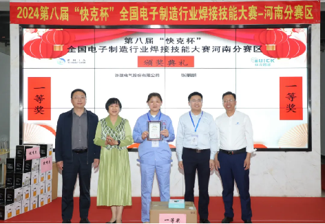 许继电气制造中心三位参赛人员沉着冷静、敢打敢拼,取得了优异成绩。朱金金、徐慧娜分别荣获“优秀奖”;张丽鹏同时斩获大赛第一名和“最佳操作规范奖”,直接晋级11月份在上海举办的全国电子制造行业焊接技能大赛全国总决赛。