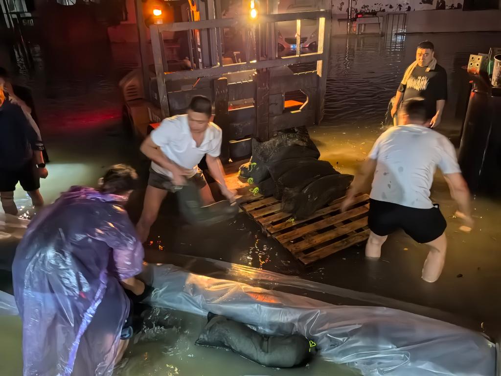 当天下午16点,低碳科技公司深入各厂区能源站所开展汛情处置,排查进水情况,组织电缆沟排水及设备防水防护,一直到凌晨雨停。晚19点35分,许昌经济开发区变压器园区周边已因暴雨积水达60厘米深,严重威胁园区电力设施安全。变压器公司党委快速响应,与低碳科技公司党支部协同商议解决方案。领导班子统一组织指挥,沉着应对,快速反应,变压器公司安质部协同低碳科技公司能源运维部、安保人员等抢险人员20余人,开展变压器园区变电所积水排水抢险工作,装填沙袋300余个,布设雨布80余米,以“第一位的工作、第一位的责任”带领全体抢险人员全力投入排水抢险。晚20点,集团本部室外道路雨水深度达20厘米,雨水沿散水渗至会议室地板,导致地板被雨水浸泡。低碳科技公司党支部组织维修班组第一时间赶赴会议中心现场检查漏雨情况,并组织研究制定墙面漏水维修方案,并于当晚11点完成抢修。经过持续8小时的雨中奋战,低碳科技公司党支部有效保障了集团各园区正常供电和次日正常生产办公。