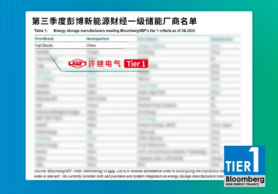 近日,全球知名研究机构彭博新能源财经(BNEF)发布2024年第三季度全球Tier1一级储能厂商榜单(BNEF Energy Storage Tier 1 List 3Q 2024),许继电气凭借高效可靠的储能产品、卓越的技术和雄厚的企业实力,在竞争激烈的储能厂商中脱颖而出,再次荣登Tier 1榜单。