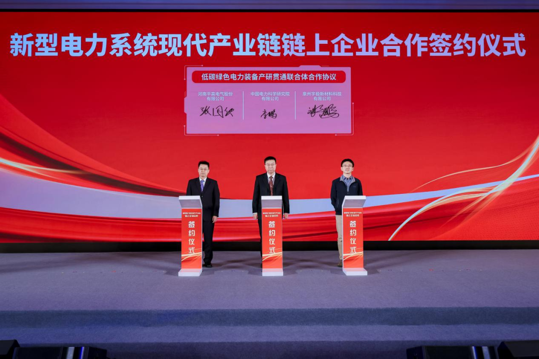 近日,新型电力系统现代产业链共链行动大会暨新型电力系统装备技术论坛在北京举办,会议由国家电网公司主办,国务院国有资产监督管理委员会、工业和信息化部、国家能源局有关领导出席会议,近百家企业、高校、科研单位领导及专家代表参会,携手推动高端输变电设备产业链供应链优化协同与融通发展。平高电气党委副书记、总经理张国跃应邀参加会议,并代表平高电气与中国电科院签署低碳绿色电力装备产研贯通联合体合作协议。