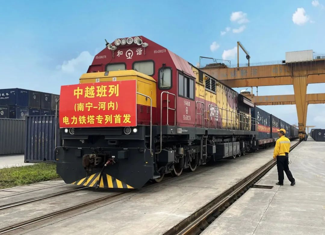 3月8日,中越(南宁-河内)班列电力铁塔专列首发仪式在广西南宁举行,山东电工电气重庆顺泰生产的越南南定一号火力发电厂至清化500千伏输电线路工程列车整装待发,即将驶出国门到达越南首都河内,这是广西首次开行电力铁塔专列,为越南电力基础设施建设提供运力保障。
