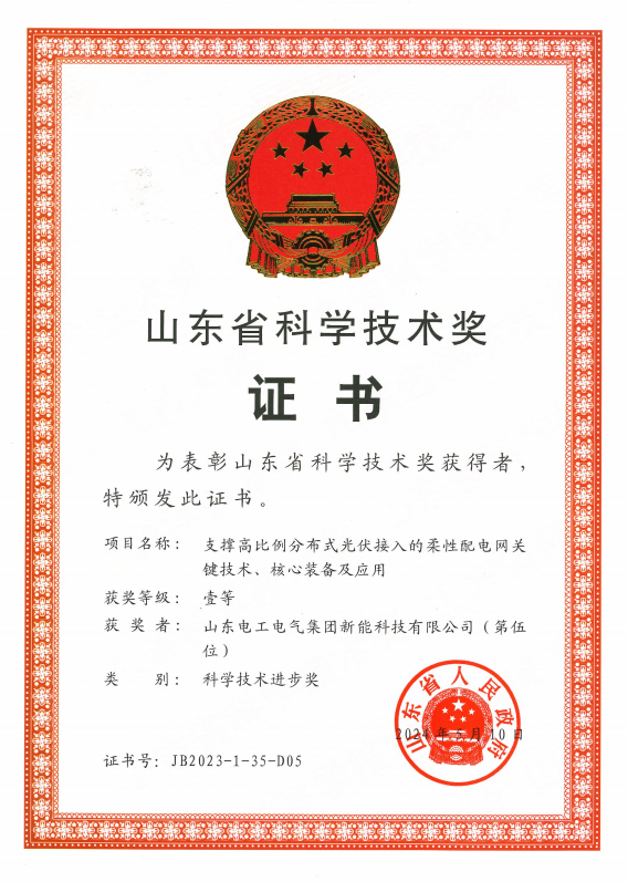近日,山东省人民政府发布《关于2023年度山东省科学技术奖励的决定》,山东电工电气所属新能科技参与完成的“支撑高比例分布式光伏接入的柔性配电网关键技术、核心装备及应用”项目荣获山东省科学技术进步奖一等奖。