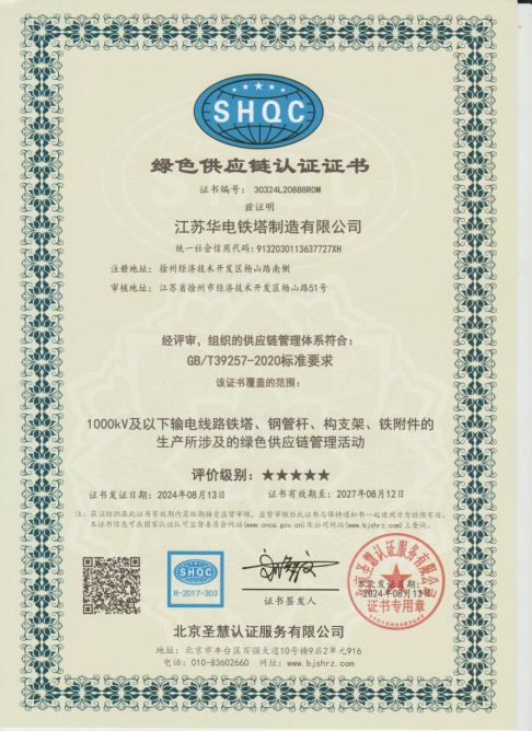 近日,江苏华电铁塔制造有限公司(以下简称“江苏华电”)绿色供应链、绿色企业、绿色工厂评价管理体系经北京圣慧认证服务有限公司现场审核认证通过,标志着江苏华电在贯彻落实新发展理念、建立健全绿色管理体系方面取得实质性成果。