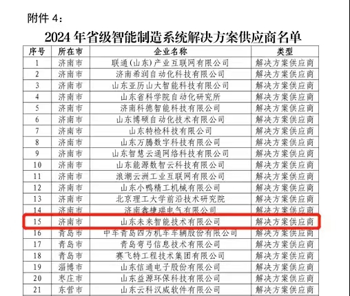 据《山东省省级智能制造系统解决方案供应商培育认定办法》(鲁工信装〔2022〕42号),山东省工业和信息化厅开展了2024年省级智能制造系统解决方案供应商评定工作。经企业申报、地市推荐、专家评审、网站公示等程序,2024年8月27日山东省工信厅公布了入选名单,全省共有32家优秀企业脱颖而出,山东电工电气所属未来智能成功入选省级智能制造系统解决方案供应商名单。