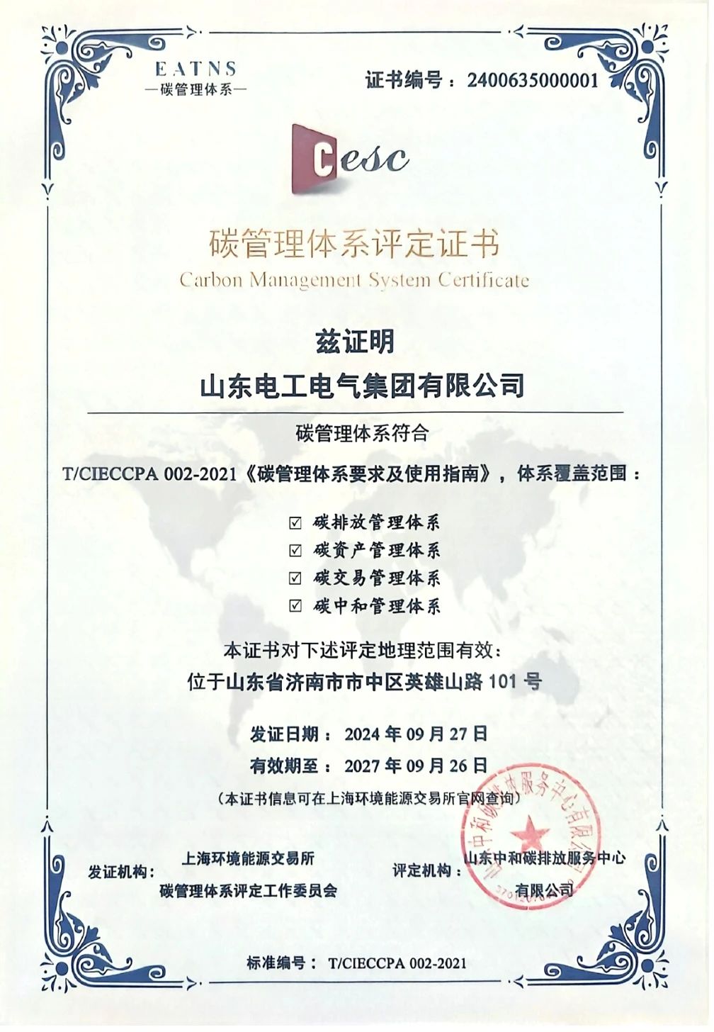 依据管理目标及实际情况,山东电工电气所属数字科技开展了为期1年的调研编制工作,累计完成碳管理手册、各项程序文件及记录文件合计60余份。经山东中和碳排放服务中心有限公司评定、上海环境能源交易所碳管理体系评定工作委员会复审,2024年9月27日,山东电工电气顺利通过EATNS碳管理体系认证。