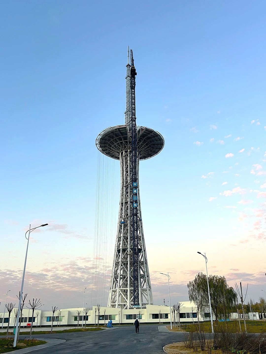 其中,广播电视发射塔为空间格构式筒体结构,建成后的高度达276米,为西北地区最高电视塔。不同于其他同类型工程,塔楼以“飞碟”式取代了传统的类球形,整体结构为偏心圆,为这座高塔塑造了极具“科幻感”的风格。同时,本项目外筒为正十二边曲线造型,底部(杆件轴心)外接圆直径36米,瘦腰段最细处外接圆直径为15.5米。单一构件最大重量19.3吨,最长16.8m,最宽3.7m,最多9个节点,最大管径Ф1500*35。结构节点多、空间结构复杂,加工精度高是本项目最大特点。